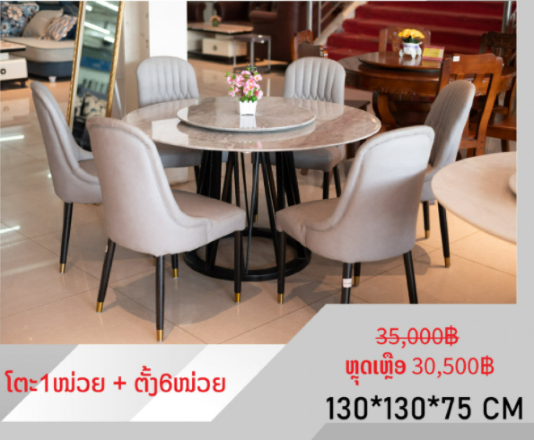 ຊຸດໂຕະກິນເຂົ້າ ມີໂຕະແບບຊົງມົນ ແລະ ແບບສີ່ຫຼ່ຽມ ວັດສະດຸທີ່ເຮັດດ້ວຍຫີນອ່ອນ, ດ້ວຍໄມ້ ແລະ ດວ້ຍເຫຼັກ ສິນຄ້າຄຸນນະພາບດີສົ່ງຕົງມາຈາກໂຮງງານ ຮັບປະກັບຄຸນນະພາບ ຮັບປະກັນລາຄາ.
