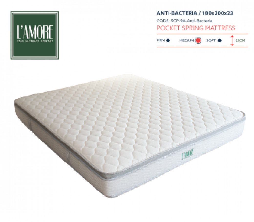 ເສື່ອນອນລາມໍ້ L'AMORE ລູ້ນ 9A-ANTIBACTERIA ເປັນເສື່ອພ໋ອກແກັດສະປີງ ຫຼື ສະປີງແຍກອີດສະຫຼະ ສາມາດປັບເຂົ້າກັບສະລີລະເປັນຢ່າງດີ ແລະ ບໍ່ສະເທືອນເວລາເໜັງຕີງ. ເປັນເສື່ອທີ່ນໍາໃຊ້ເທັກໂນໂລຊີ ຢັບຢັ້ງເບັກທີເລຍ ໄດ້ເຖີງ 99,999% ຮັບຮອງຈາກສະຖາບັນຈາກປະເທດສະວິດ ສອບຖາມຂໍ້ມູນເພີ່ມເຕີມໄດ້