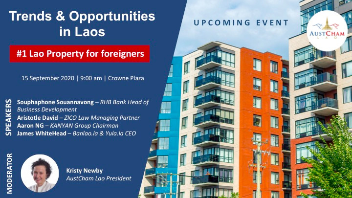 Austcham Lao and Banlao.la invite you to their upcoming "Trends and Opportunities in Laos Series" « Lao Property for Foreigners » on the 15th of September at 9 am in the Crowne Plaza.