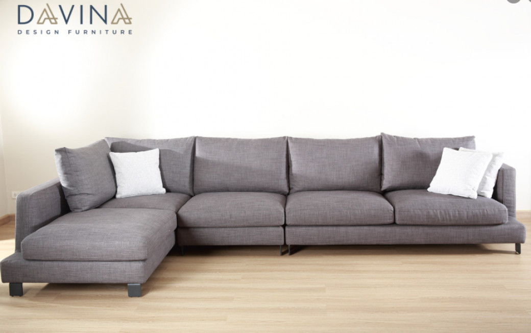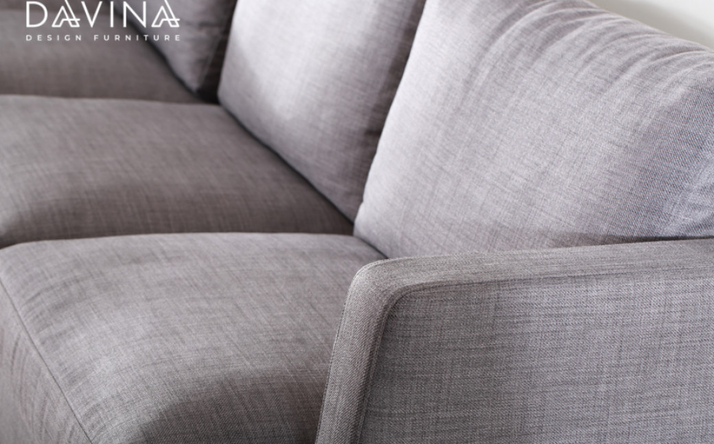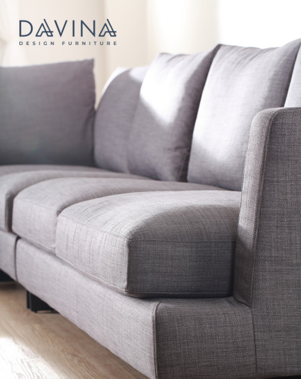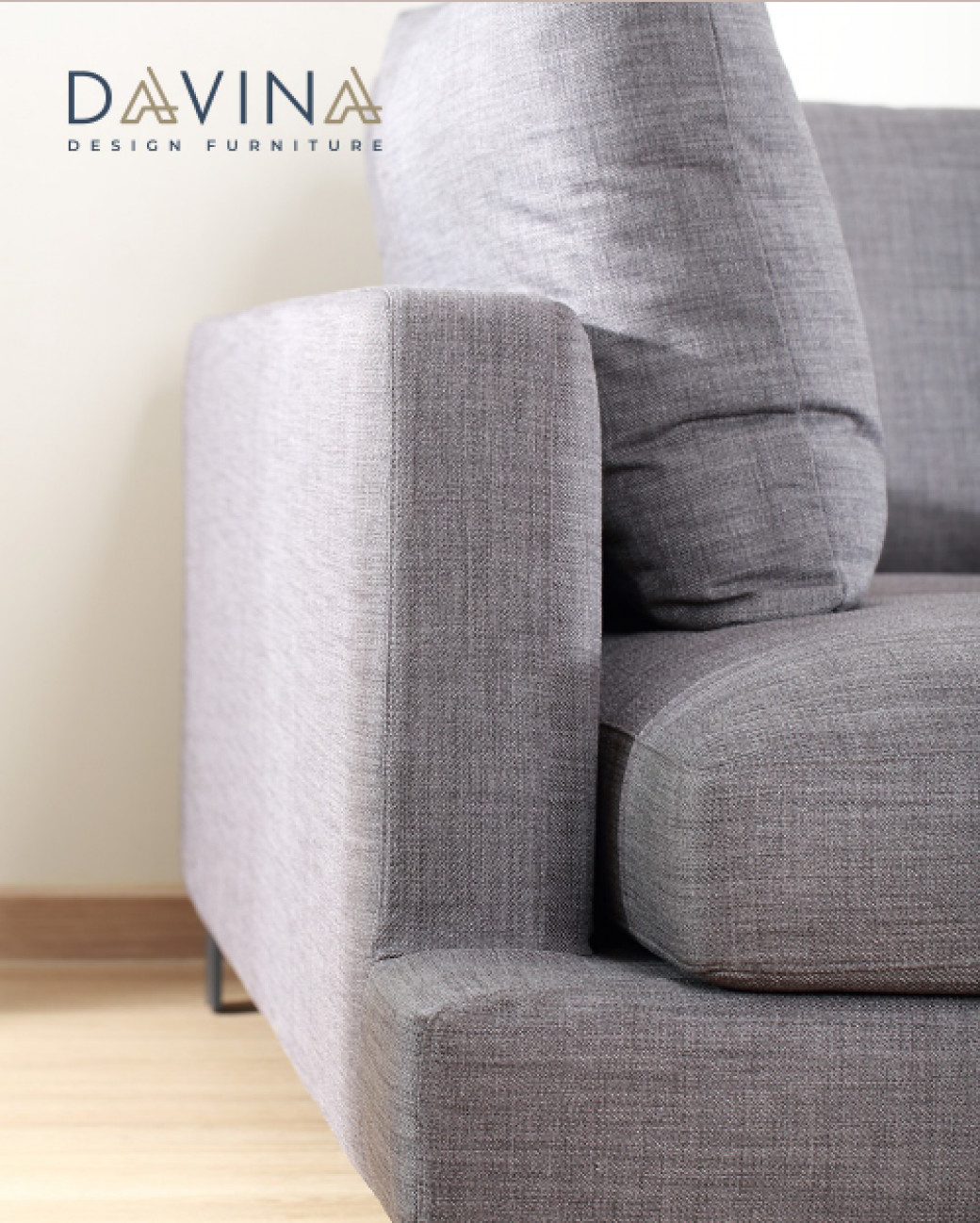 ໂຊຟາເຊັດນີ້ດີຊາຍທີ່ລຽບງ່າຍ ແບບບໍ່ເບື່ອ ຊົງທັນສະໃໝ. ຫຸ້ມດ້ວຍຜ້າສີເທົາເຂັ້ມ.